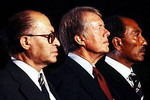 | Photo Title: Camp David Peace Accords. 1978. Egypt Israel Peace Treaty. President Sadat, Prime Minister Begin & President Carter. Camp David Departure Ceremony. |