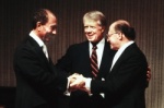 Photo Details Camp David Peace Accords. 1978. Egypt Israel Peace Treaty. President Sadat, Prime Minister Begin & President Carter. Camp David Departure Ceremony.